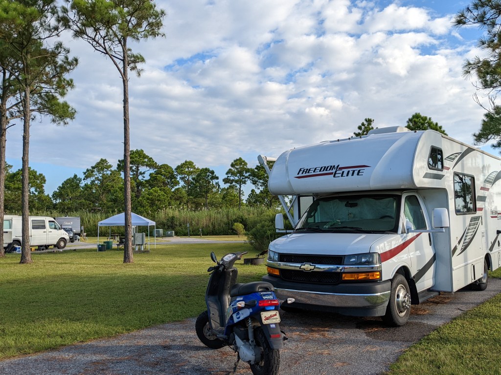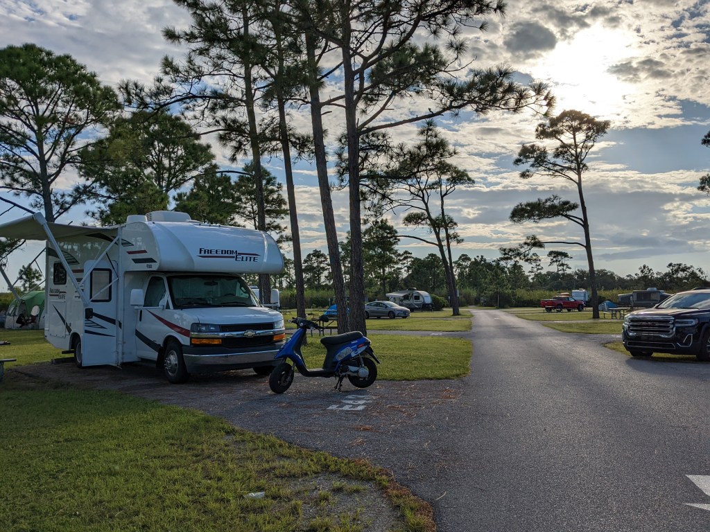 I didn’t know there were forests down here just off the beaches. Fort Pickens, Florida is a peninsula in the panhandle area of this giant boot-shaped state. It’s cool and breezy this morning. The Cicada choir sings, accompanying children’s laughter and families chatting, cooking breakfasts, and packing for their Saturday adventures. I could sit here for hours if only the heat would stay low.